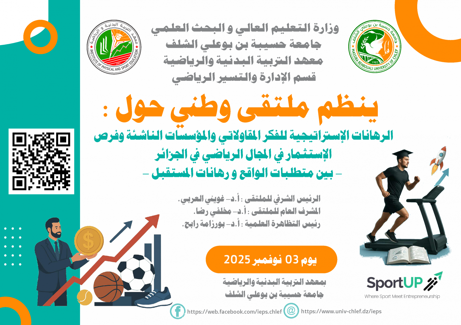لفكر المقاولاتي و المؤسسات الناشئة موضوع ملتقى وطني نظم معهد التربية البدنية والرياضية – قسم الإدارة والتسيير الرياضي ملتقى وطنيًا موسومًا بـ:الرهانات الإستراتيجية للفكر المقاولاتي والمؤسسات الناشئة وفرص الاستثمار في المجال الرياضي في الجزائر بين متطلبات الواقع ورهانات المستقبل، اليوم الإثنين 3 نوفمبر، بقاعة المحاضرات بالقطب الجامعي أولاد فارس. جاءت برمجة الملتقى بالتزامن مع احياء… Continue reading فعاليات الملتقى الوطني “الرهانات الإستراتيجية للفكر المقاولاتي والمؤسسات الناشئة وفرص الإستثمار في المجال الرياضي في الجزائر– بين متطلبات الواقع ورهانات المستقبل-” 03 نوفمبر 2025