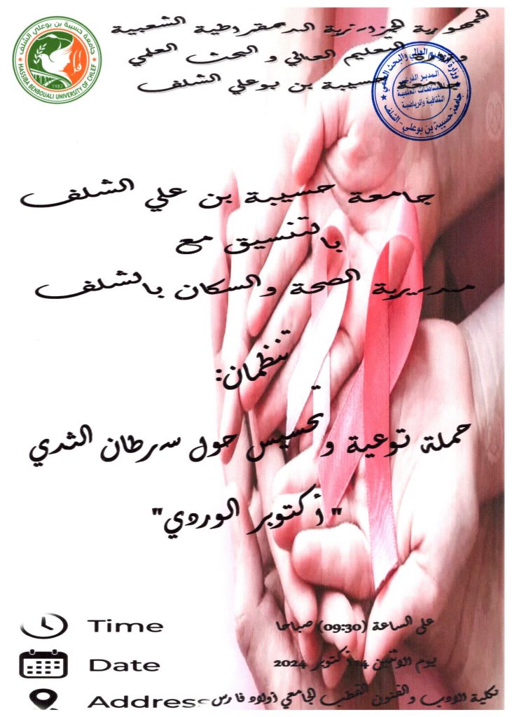 جامعة حسيبة بن بوعلي و بالتنسيق مع مديرية الصحة و السكان بالشلف تنظمان : حملة توعية و تحسيس حول سرطان الثدي (أكتوبر الوردي) و ذلك يوم الاثنين 14 أكتوبر 2024 على الساعة 30:09 صباحا بكلية الاداب و الفنون بالقطب الجامعي بأولاد فارس.