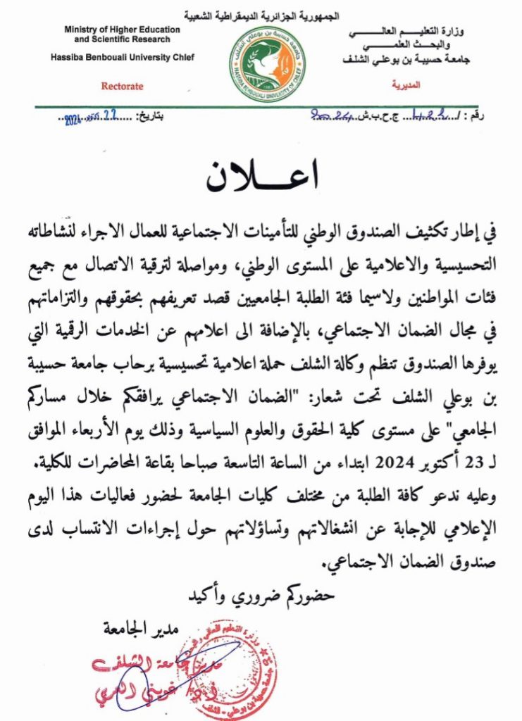 اعلان خاص بالطلبة(حملة اعلامية تحسيسية برحاب جامعة الشلف تحت شعار”الضمان الاجتماعي يرافقكم خلال مساركم الجامعي” )