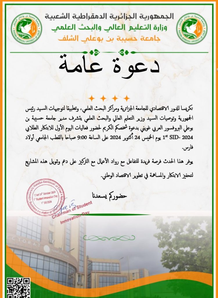 تكريسا للدور الاقتصادي للجامعة الجزائرية ومراكز البحث العلمي، وتطبيقا لتوجيهات السيد رئيس الجمهورية وتوصيات السيد وزير التعليم العالي البحث العلمي يتشرف مدير جامعة حسيبة بن بوعلي البروفسور العربي غويني بدعوة شخصكم الكريم لحضور فعاليات اليوم الاول للابتكار الطلابي 1st SID- 2024يوم الخميس 24 أكتوبر 2024 على الساعة 9:00 صباحا بالقطب الجامعي أولاد فارس.