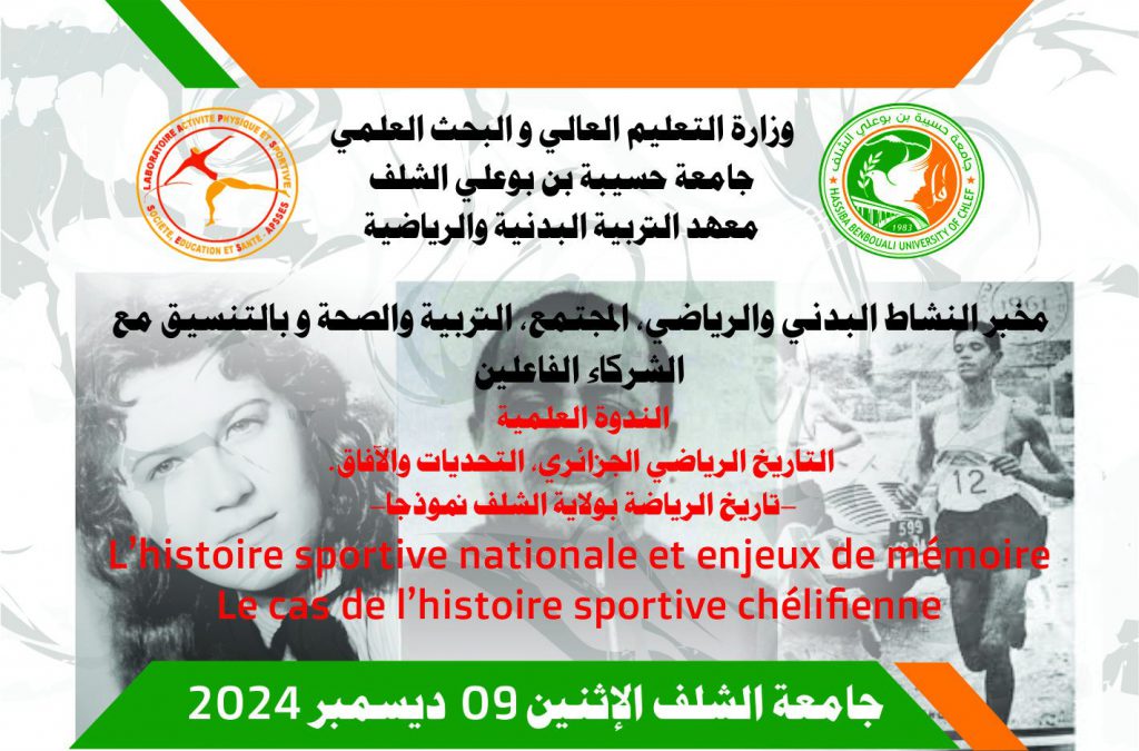 تزامنا مع ذكرى مظاهرات 11 ديسمبر 1960 نظم معهد التربية البدنية والرياضية بالتنسيق مع مخبر النشاط البدني الرياضي،المجتمع،التربية والصحة ندوة علمية يوم 09 ديسمبر 2024 تحت عنوان التاريخ الرياضي الجزائري تحديات وآفاق-ولاية الشلف نموذجاُ.