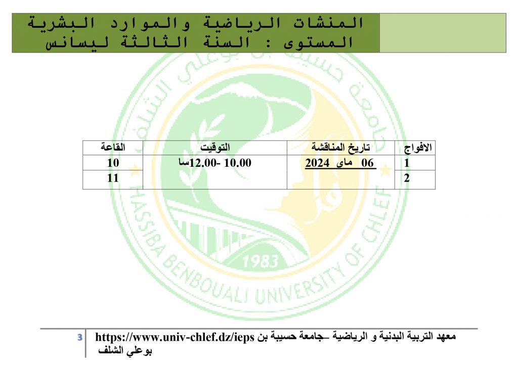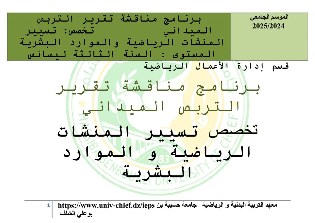 اعلان للطلبة قسم ادارة الاعمال في الرياضةمناقشة التربص الميداني