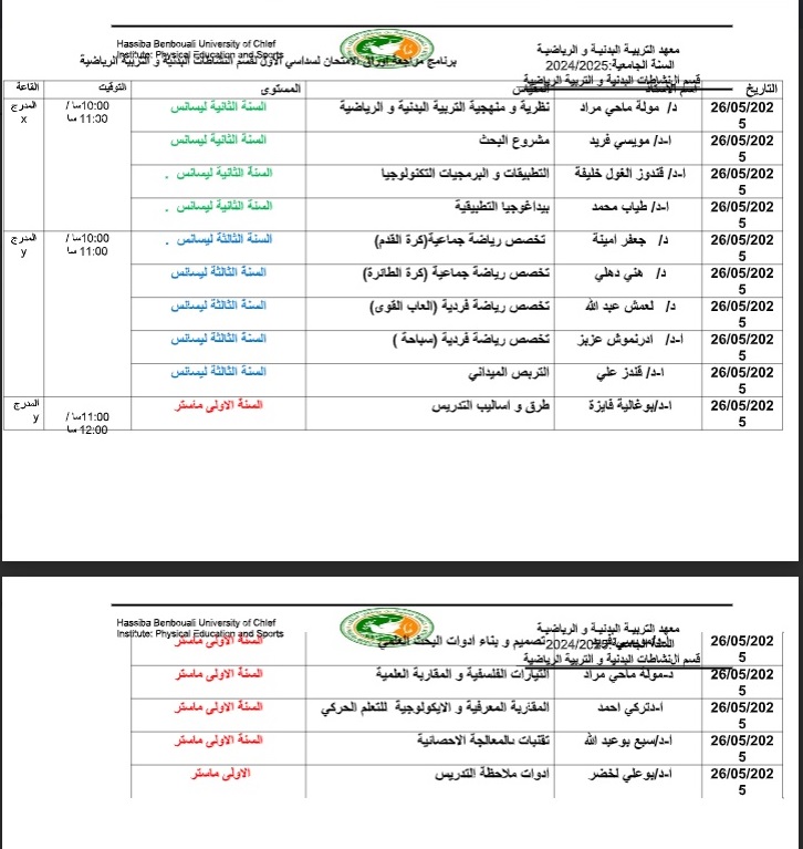 برنامج مراجعة اوراق الامتحان السداسي الثاني لقسم النشاطات البدنية و التربية الرياضية للسداسي الثاني