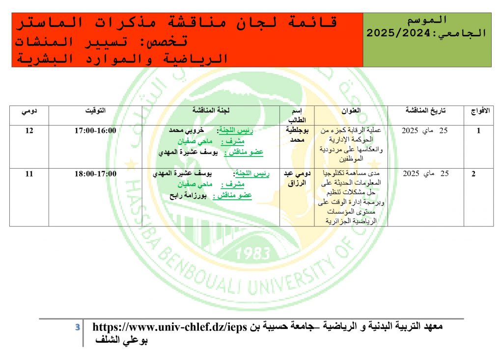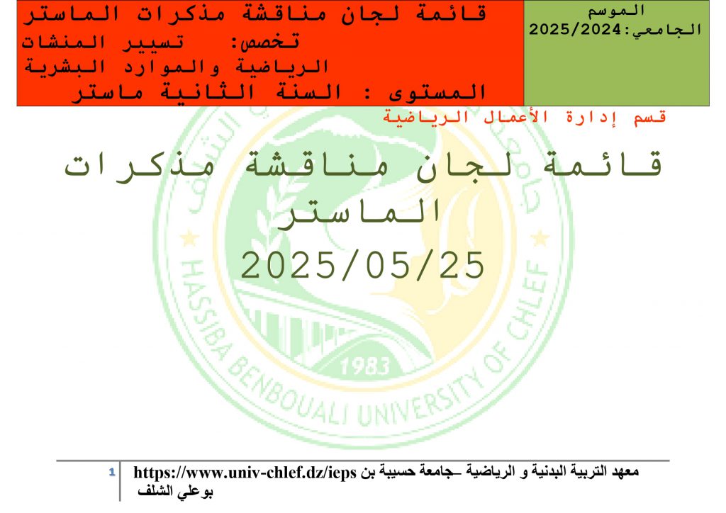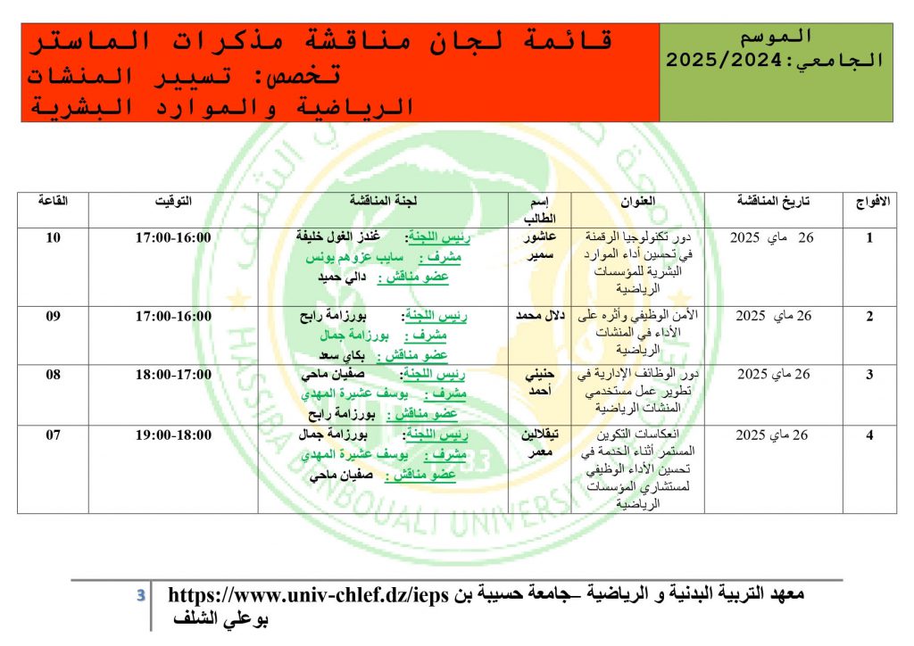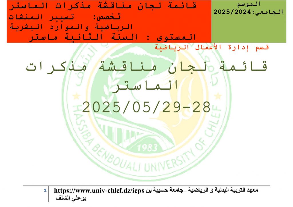 برنامج مناقشة مذكرة الماستر قسم إدارة الأعمال الرياضية