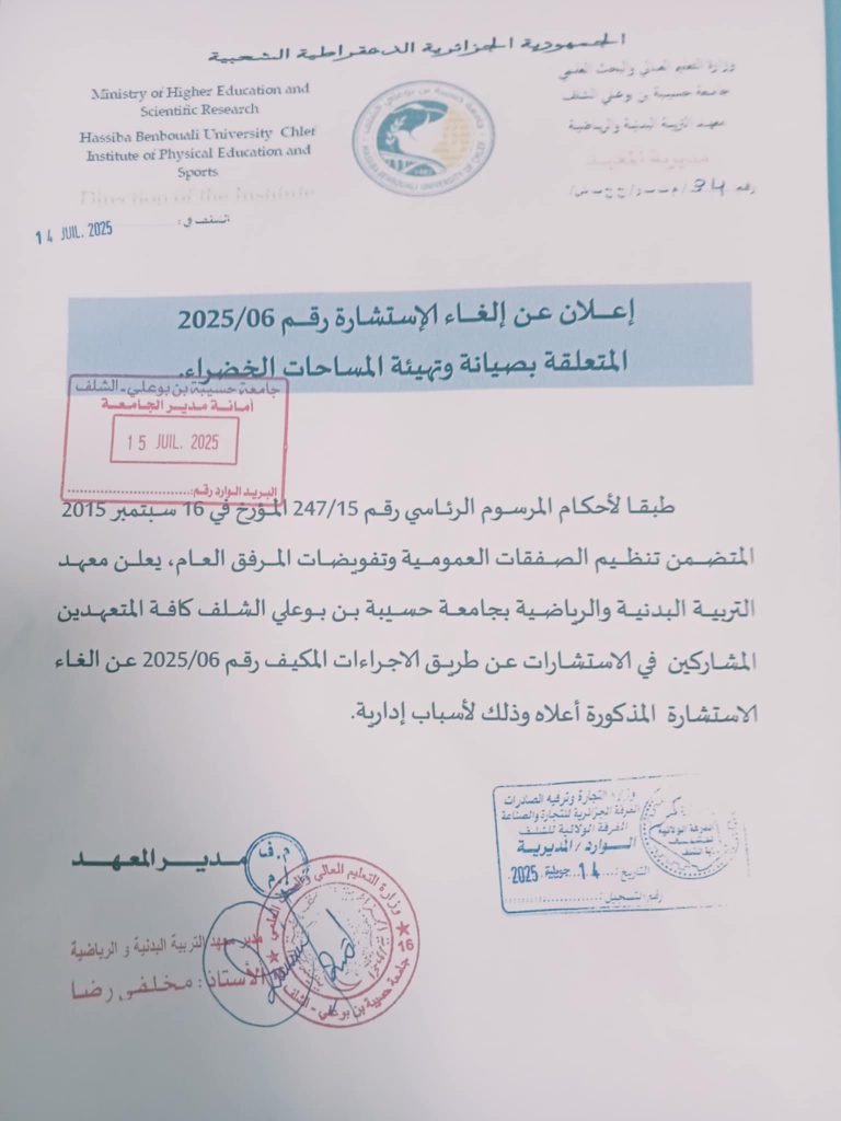 اعلان عن الغاء الاستشارة رقم 2025/06