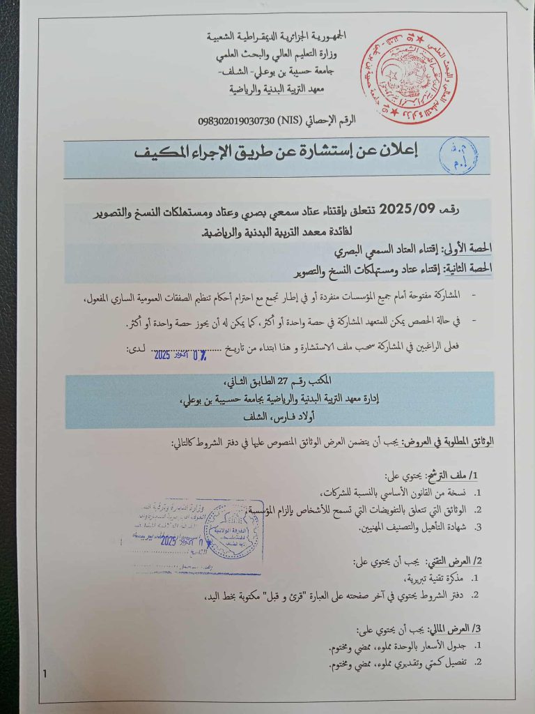 اعلان عن استشارة رقم 2025/09 عن طريق الاجراء المكيف