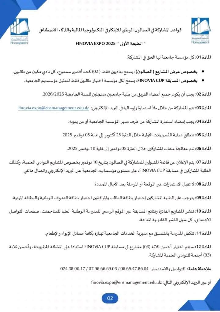 « تعلم المديرية الفرعية للانشطة العلمية الثقافية و الرياضية جميع طلبة جامعة حسيبة بن بوعلي الشلف الراغبين في المشاركة و تمثيل الجامعة في الصالون الوطني للابتكار في التكنولوجيا المالية و الذكاء الاصطناعي التقرب من مصالح الانشطة العلمية الثقافية و الرياضية على مستوى الكليات و المعهدين أو مقر المديرية الفرعية للانشطة العلمية الثقافية و الرياضية المتواجدة بمديرية الجامعة من أجل التسجيل قبل تاريخ 03 نوفمبر 2025 مرفوقين بالشهادة المدرسية للموسم الجامعي 2026/2025 « .
