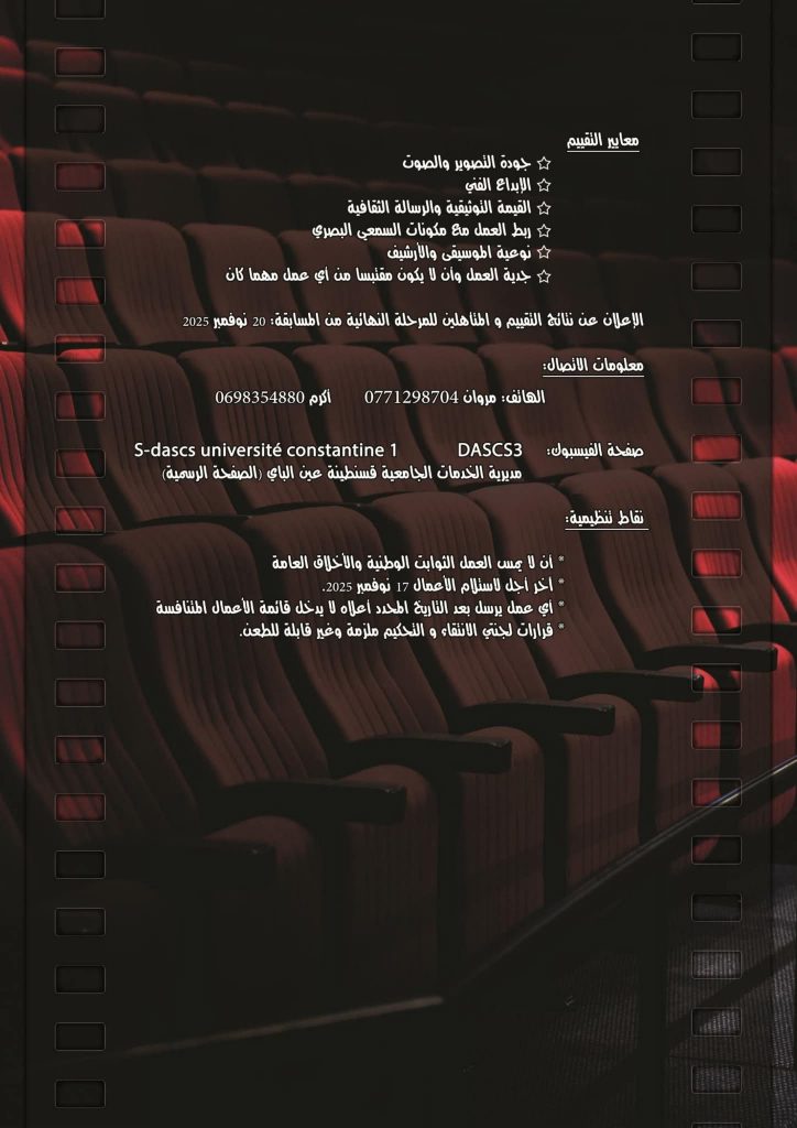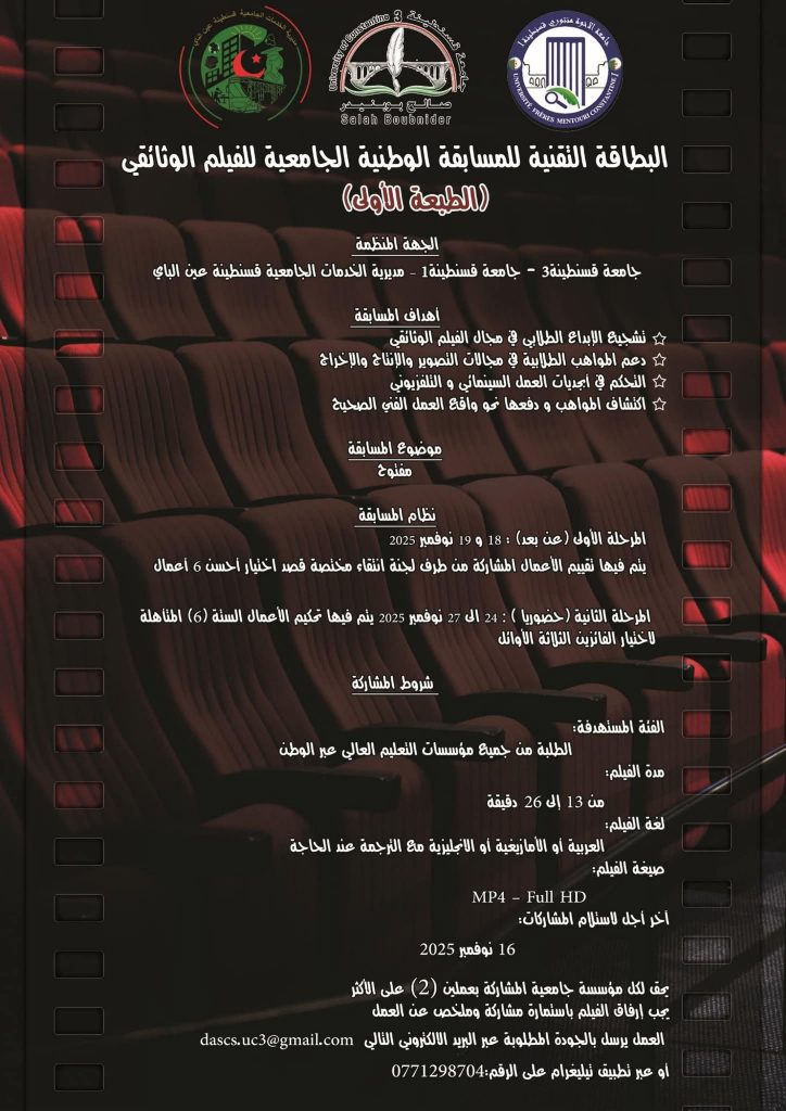 « تعلم المديرية الفرعية للانشطة العلمية الثقافية و الرياضية جميع طلبة جامعة حسيبة بن بوعلي الشلف الراغبين في المشاركة و تمثيل الجامعة في الطبعة الاولى للمسابقة الوطنية الجامعية للافلام الوثائقية التقرب من مصالح الانشطة العلمية الثقافية و الرياضية على مستوى الكليات و المعهدين أو مقر المديرية الفرعية للانشطة العلمية الثقافية و الرياضية المتواجدة بمديرية الجامعة من أجل التسجيل قبل تاريخ 16 نوفمبر 2025 مرفوقين بالشهادة المدرسية للموسم الجامعي 2026/2025 « .