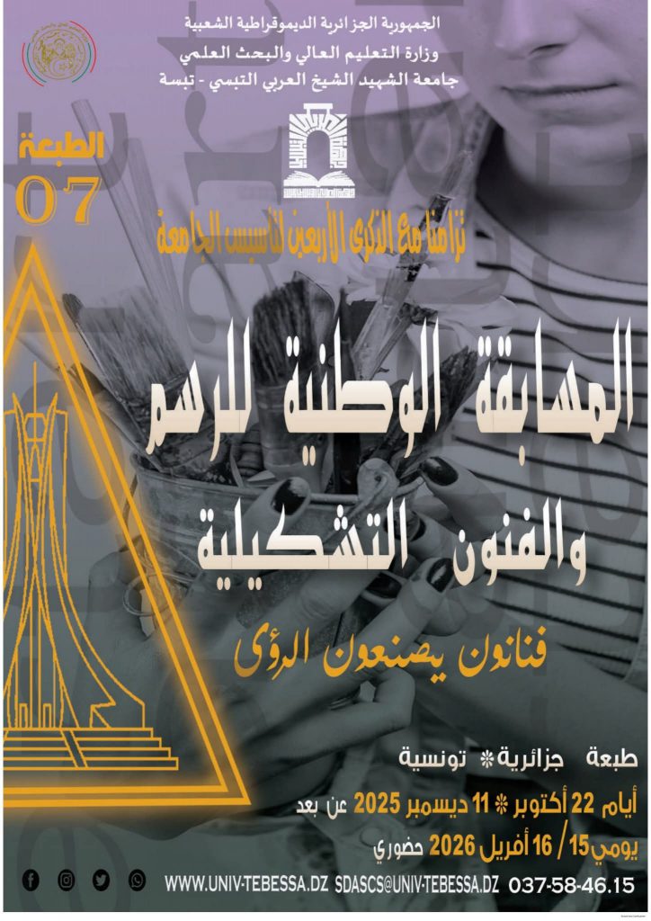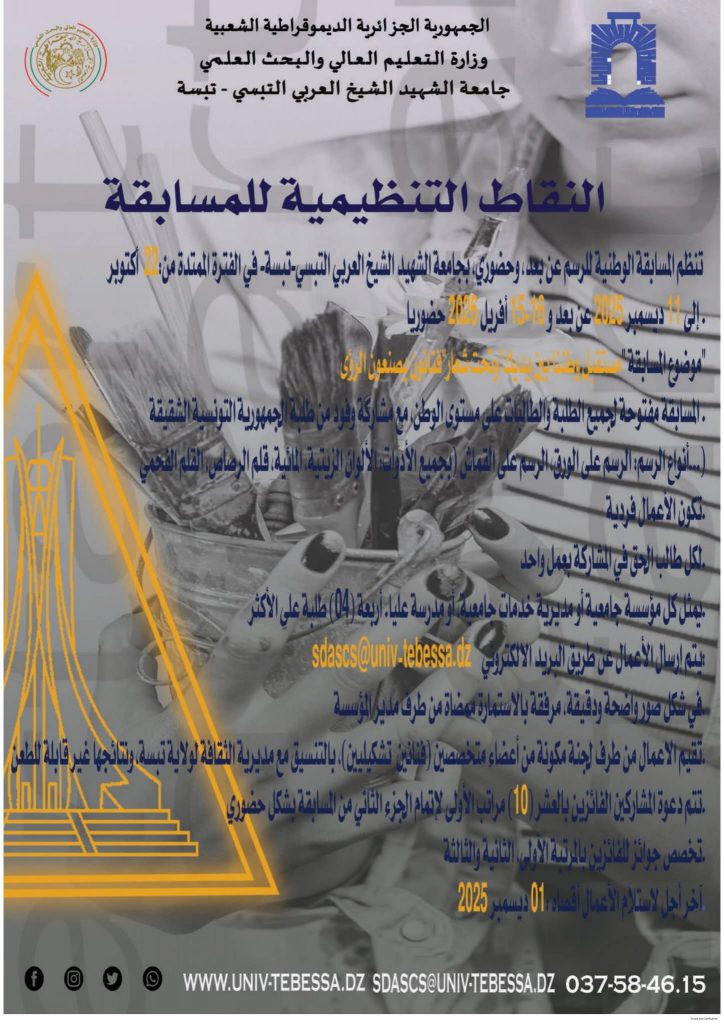 « تعلم المديرية الفرعية للانشطة العلمية الثقافية و الرياضية جميع طلبة جامعة حسيبة بن بوعلي الشلف الراغبين في المشاركة و تمثيل الجامعة في الطبعة السابعة للمسابقة الوطنية في الرسم و الفنون التشكيلية عن بعد و حضوري التقرب من مصالح الانشطة العلمية الثقافية و الرياضية على مستوى الكليات و المعهدين أو مقر المديرية الفرعية للانشطة العلمية الثقافية و الرياضية المتواجدة بمديرية الجامعة من أجل التسجيل قبل تاريخ 10 ديسمبر2025 مرفوقين بالشهادة المدرسية للموسم الجامعي 2026/2025 « و الأعمال المنجزة.